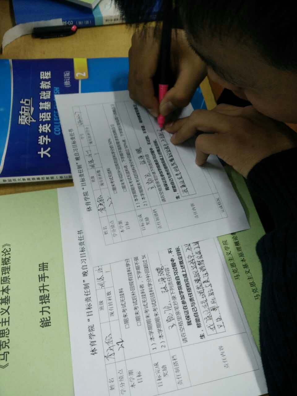 “目标责任制”晚自习在新华楼201教室正式开始。学院15、16两个年级学生和14级挂科超过3科的学生全员参加,由学院学生工作部主任李叙瑶老师全程陪同。晚自习采用指纹机打卡签到、签退,学院每两周将在校园网、学院网站、学院微平台、家长微信群公布一次考勤情况。2小时晚自习期间,学生手机均统一上交,以保证自习质量。在第一天的自习开始前,学生们统一签署了学院下发的《麻豆porn
