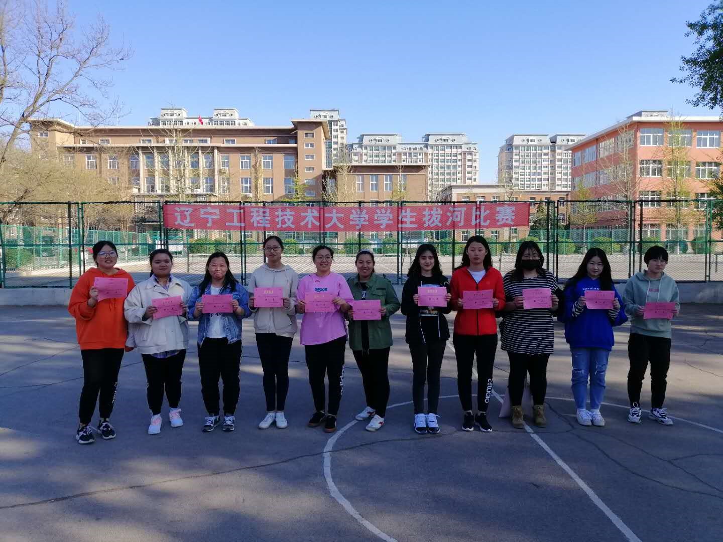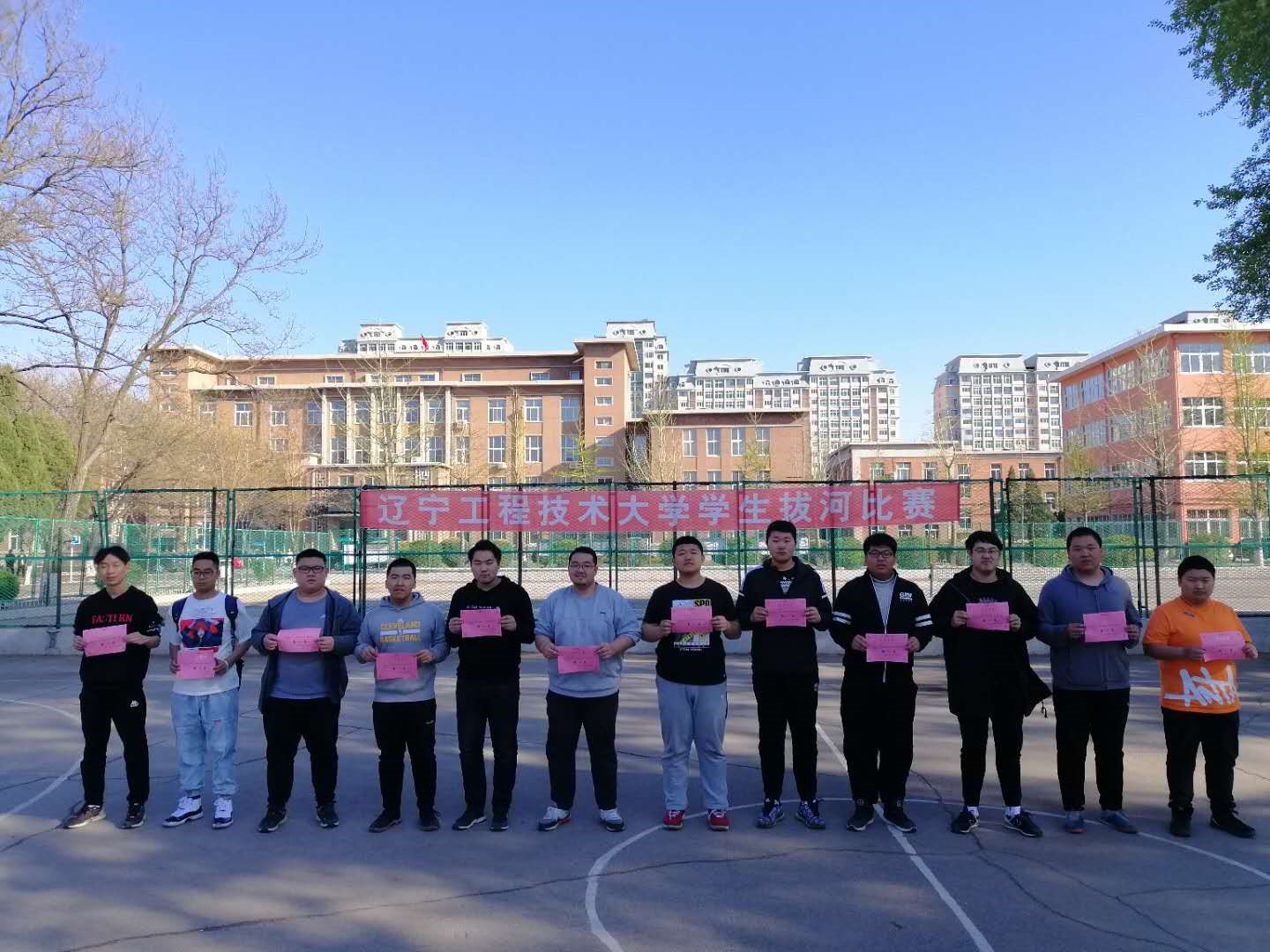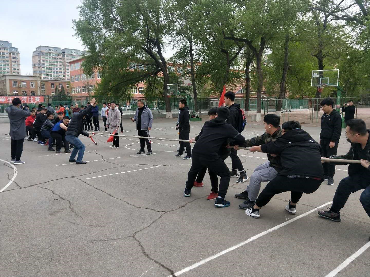 中华路校园拔河比赛,如期在校西篮球场举行。此次活动主要为贯彻“校体育工作条例”和“全民健身计划纲要”,推动学校群众性体育活动的开展,活跃校园文化生活为宗旨,丰富学生们的课余生活为目的,用比赛的形式为学生们提供展现各学院风采的机会,通过比赛发扬团队精神,增强同学们之间的凝聚力。此次比赛各学院都以较高的热情参与其中,同学们也自发的组成啦啦队为自己的同学加油,赛场上欢呼声,呐喊声此起彼伏,处处洋溢着青春的气息,充分展现出了当代大学生青春风貌。最终男子组力学与工程学院获得第一名,材料科学与工程学院和公共管理与法学院分别获得二、三名;女子组理学院获得第一名,公共管理与法学院和环境科学与工程学院分别获得二、三名。 通过这次比赛,培养了同学们的团结协作精神,增进了同学们之间的交流,使同学们的集体荣誉感大大增强,同时也丰富了同学们的课余生活。