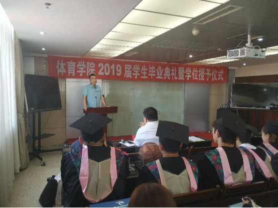 典礼第一项,由学院党总支书记韩雪峰宣读学位授予决定并致辞。韩书记代表学院祝贺毕业生们圆满完成学业,他强调,体育学子应当在今后的工作和生活中不断拼搏,取得自己的辉煌。他鼓励毕业生们以“诚朴求是,博学笃行”的校训精神为指引,继续走好未来的人生路。
