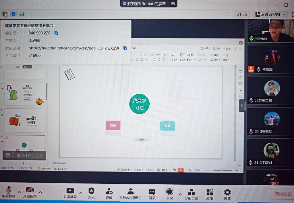 学生的考研热情,明确考研目标,了解更多复习方式和技巧,学院组织了考研经验分享会,由运动训练2018级1班的郭震旦同学作为主讲人。他以优异的成绩考取了曲阜师范大学体育科学学院运动训练专业研究生。他分享了有关报考院校的选择、考研资料的搜集、复习计划的制定、考研心态的调试以及复习的战略战术等宝贵经验,学院300余名学生参会,20余名学生线上互动交流。