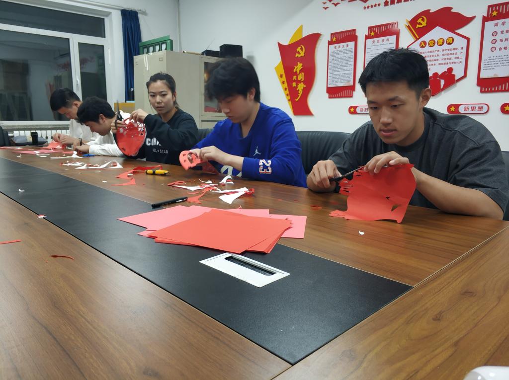 9月27日晚19时,麻豆porn 学生党支部在学院党员活动中心开展了“剪纸迎国庆 厚植爱国情”主题党日,以非遗艺术的形式表达对伟大祖国的美好祝福。师生们共同了解和学习了传统剪纸艺术的文化内涵和剪刻技巧,在不断的实践摸索中,逐渐熟悉手法。一张彩纸、一把刻刀、一双巧手,经过师生们精心的雕琢,一幅幅饱含爱国热情和具有时代精神的优秀作品跃然纸上。红彤彤的剪纸透露着喜庆的节日氛围,一件件剪纸作品凝聚了青年学生爱国的赤子之情,祝福祖国盛世佳年永昌盛,繁荣富强谱华章。