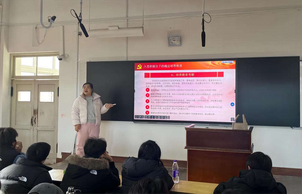 李叙瑶老师以《以权责明确党员标准 以程序坚定入党初心》为题,围绕共产党员的标准、入党的条件、党员的权利和义务、入党程序四个方面深入讲解。她强调,全体学生特别是入党积极分子要熟悉发展党员的程序,明确党员的责任和义务,坚定初心、端正动机,在学习和生活中精于奋进、勇于奉献,充分发挥先锋模范作用,时刻以党员的标准规范自己,以实际行动向党组织靠拢,做奋发图强的新时代青年。