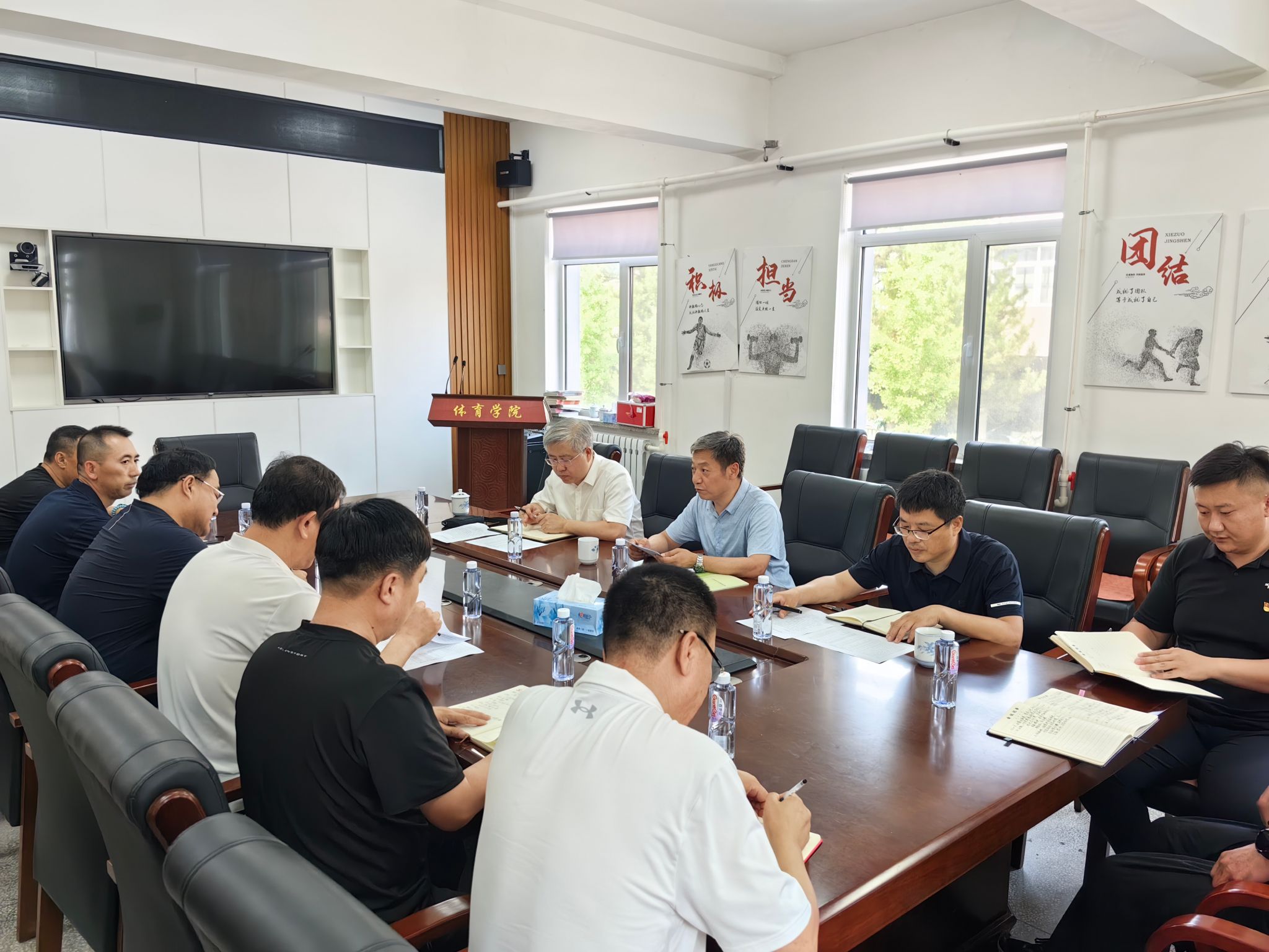 党委书记田中雨首先从建院背景、师资力量、场馆建设、教学科研、赛事成绩和发展规划等方面介绍了学院的基本情况。随后院长刘大明在人员梯队建设、场馆安全隐患和教师职称评定等方面存在的问题和需求做了专题汇报。最后副院长杜江、王雷、陈雷就分管工作分别进行了补充和交流。