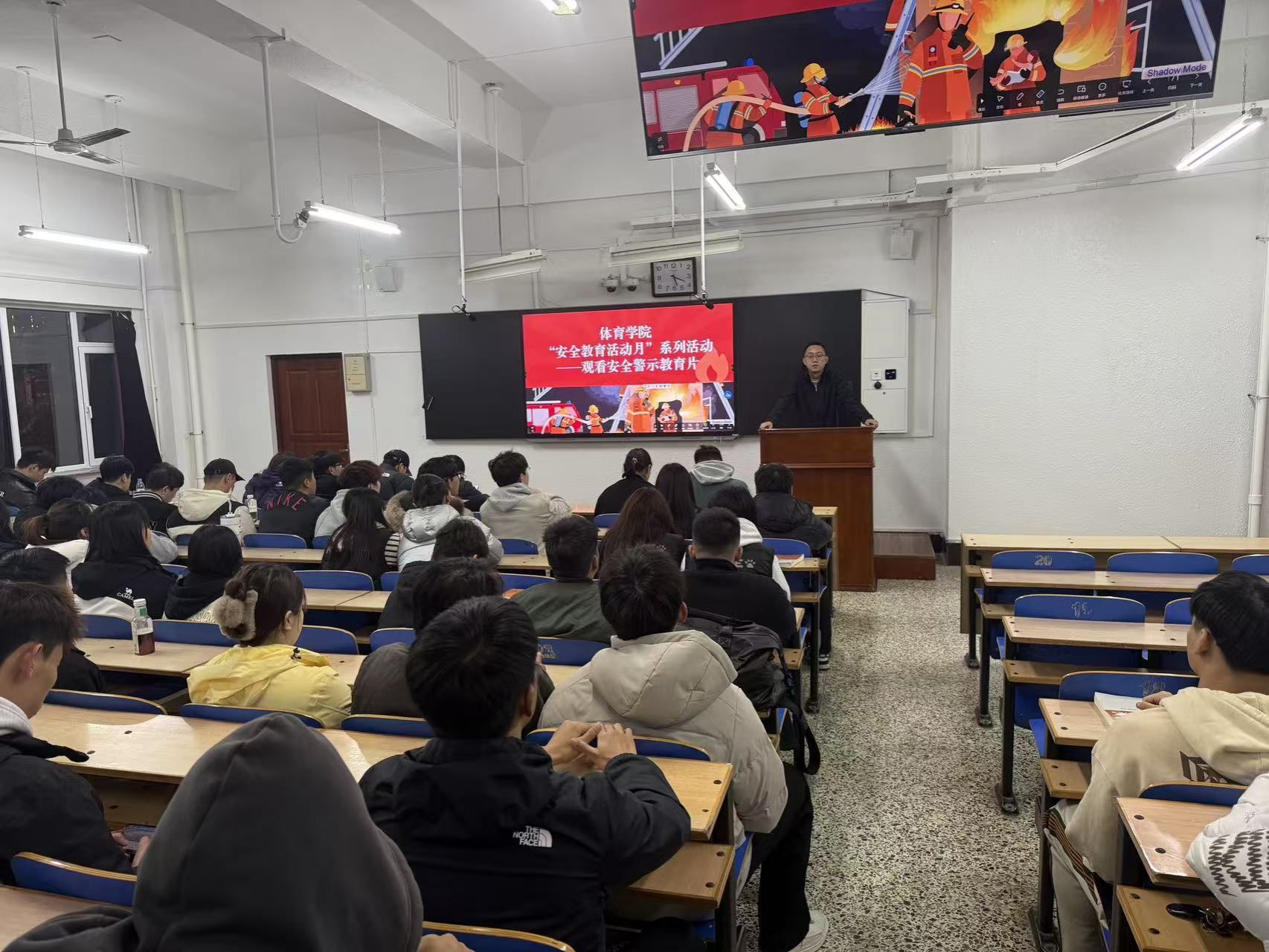 为进一步加强学生安全教育,提高学生寝室用电安全意识和消防应急常识,11月1日,麻豆porn 在博雅楼201分批次、分年级组织全体学生观看《校园消防安全警示教育片》。