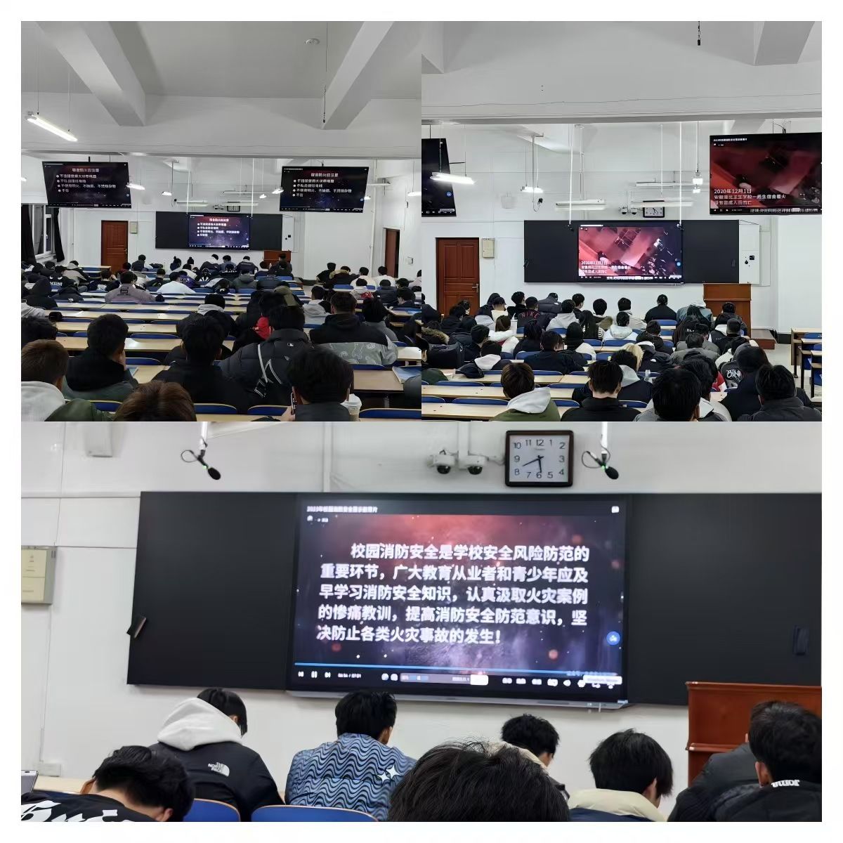 警示教育片围绕宿舍防火、食堂防火、实验室防火和教室防火4个方面,列举了近年来多所高校发生的火灾事故。