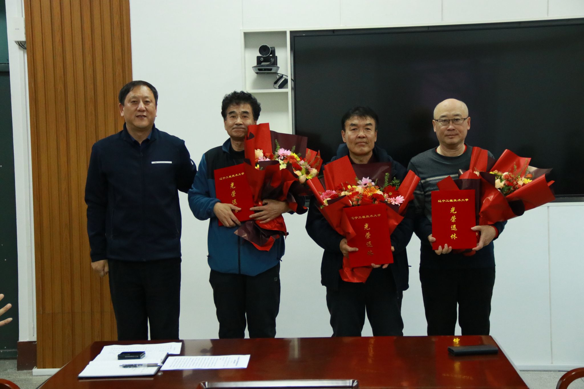 在热烈的掌声中,三位新入职教师向退休教师献花,院党委书记田中雨为退休教师颁发荣退证书。