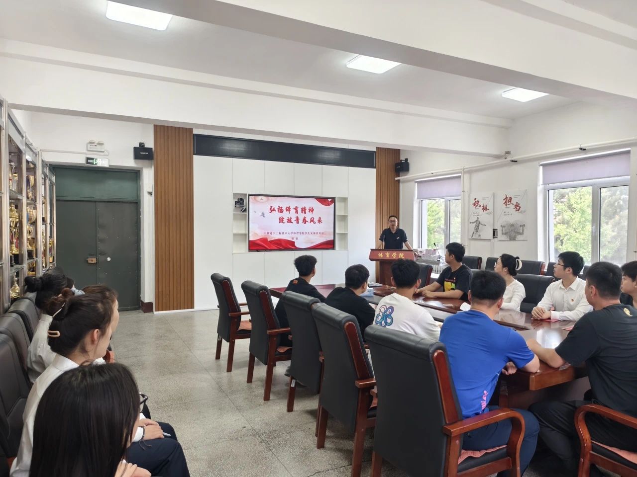学生党支部书记郑重以“弘扬体育精神,绽放青春风采”为题,为毕业生党员们带来了一堂深刻而生动的党课。课堂上,郑重老师从体育精神的内涵、青春风采的底色、实现理想的路径三个方面向毕业生党员阐述如何将体育精神转化为干事创业的动力。对于即将踏入社会的体育学子而言,要坚持理想信念,无论年龄、岗位,始终牢记“为党和人民牺牲一切”的誓言;要胸怀接续奋斗,伟大事业需要一代代人接力奔跑;要勇于自我革新,吾日三省吾身,常思“初心是否依旧”。党课的最后,郑重老师代表学院全体教师,祝愿毕业生党员不负时代、不负韶华,让体育精神与青春风采在党旗下交相辉映!